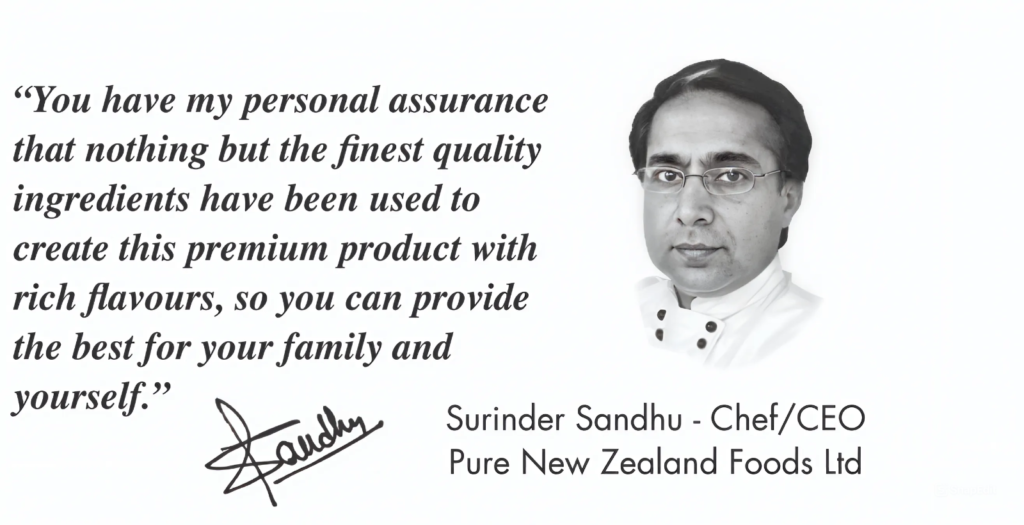 At Pure New Zealand Foods, we have always been passionate about creating food products that are natural and pure, free of chemicals or artificial ingredients. This has served as the company’s guiding principle throughout its history and is evident in every product that we import and produce. Knowing that every product bearing our brand contains only healthy, high-quality ingredients, we confidently serve Sandhu’s premium meals and Bellissimo meals, and accompaniments to our own family and friends.